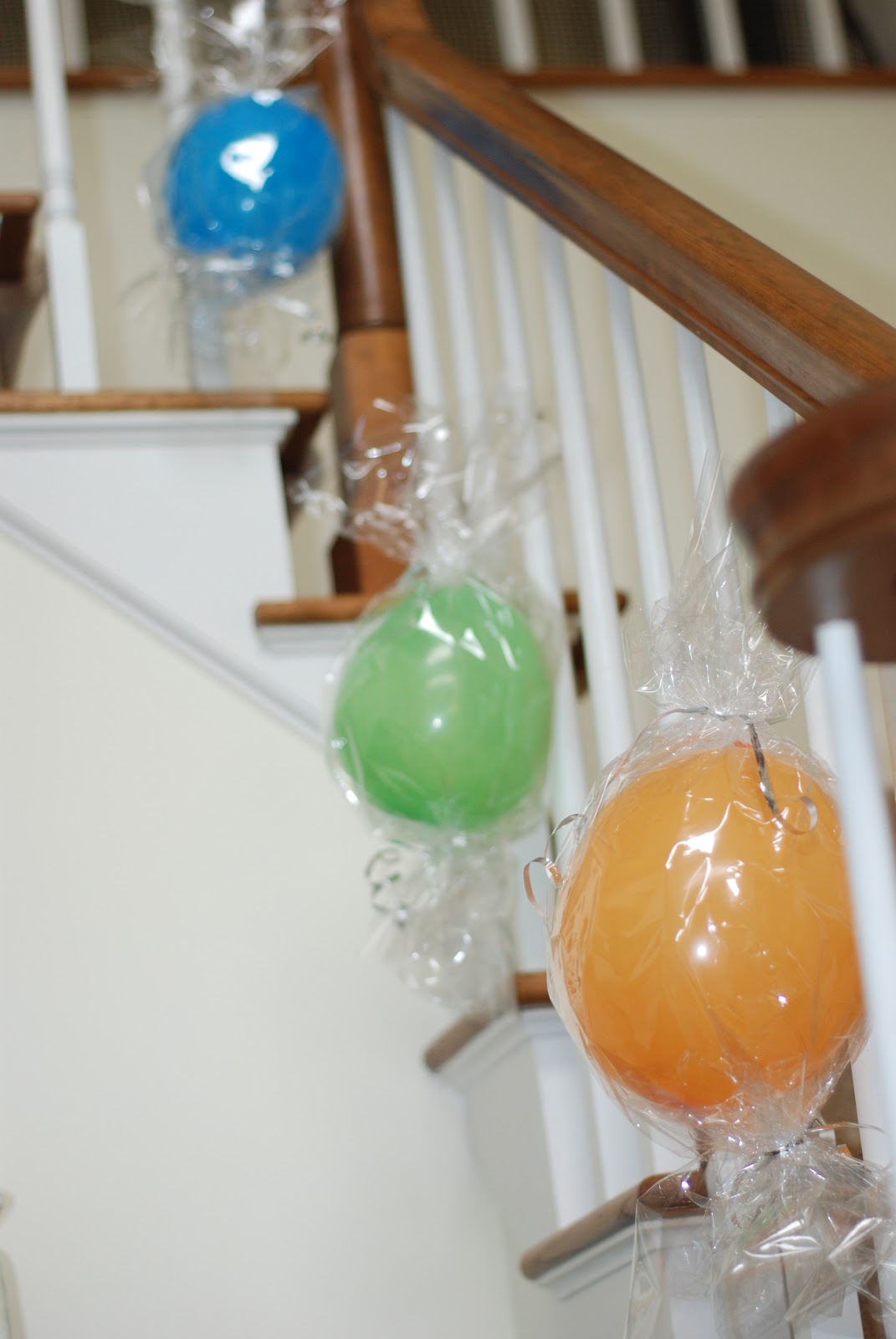 So easy, you blow up a balloon and wrap it with clear cellophane, then tie the ends with ribbon.